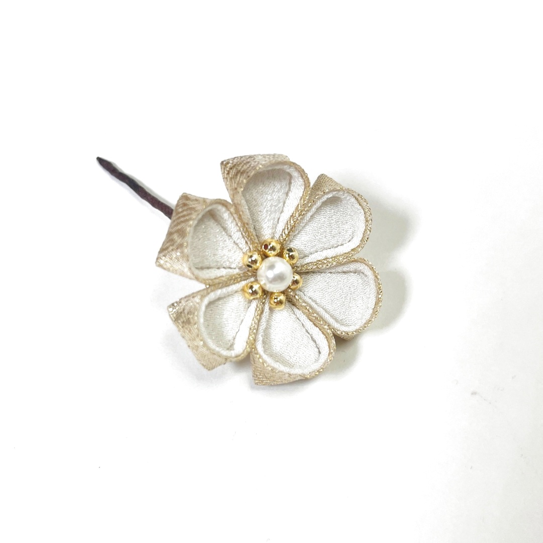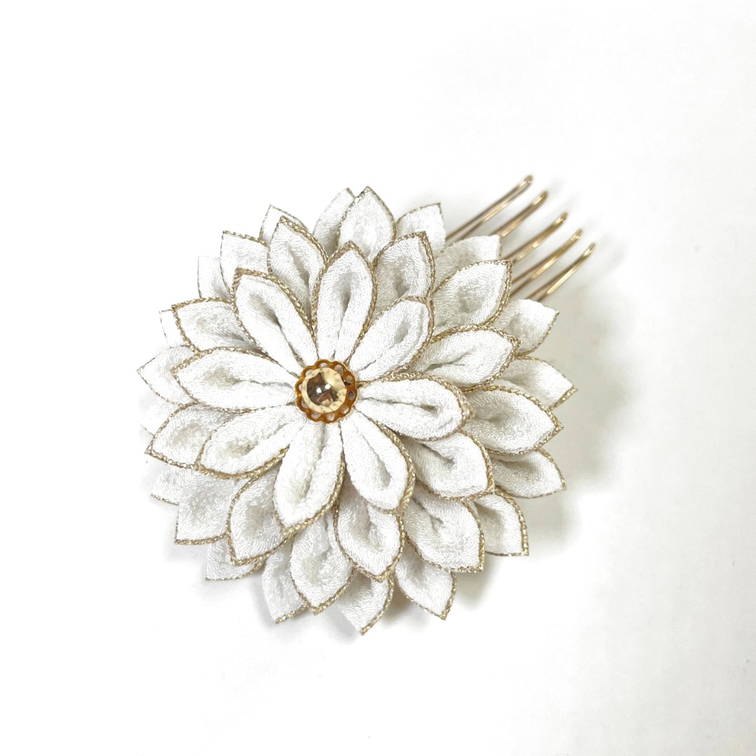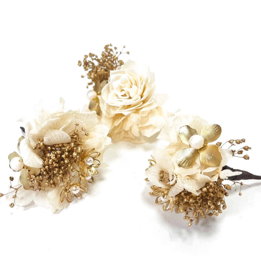 ゴールドと白の生地を2枚仕立てにしたダリアのつまみ細工と、ゴールドと白を中心としたメタルフラワー・プリザーブドフラワー・ドライフラワーをピン仕立ての髪飾りにしました。