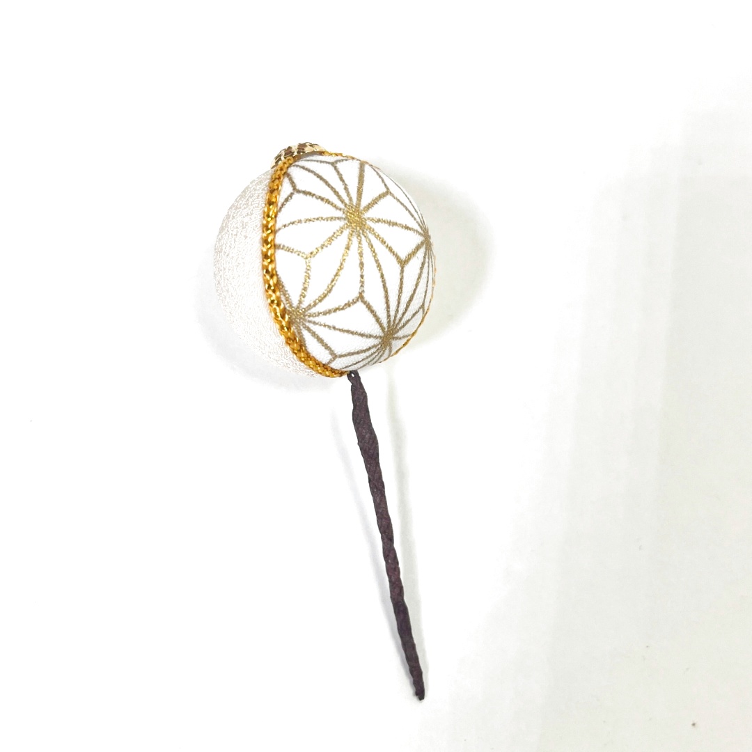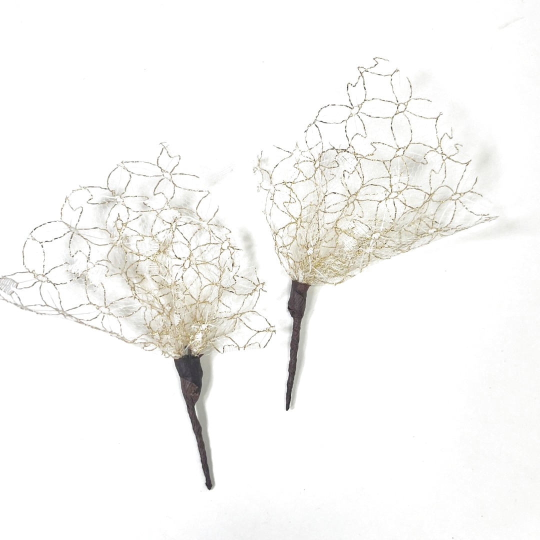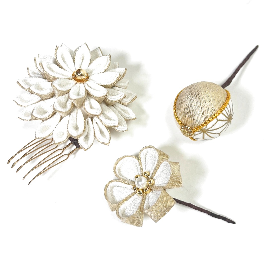 ゴールドと白の生地を2枚仕立てにしたダリアのつまみ細工と、ゴールドと白を中心としたメタルフラワー・プリザーブドフラワー・ドライフラワーをピン仕立ての髪飾りにしました。