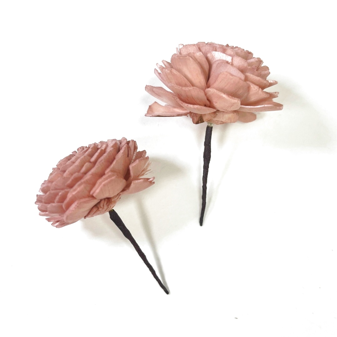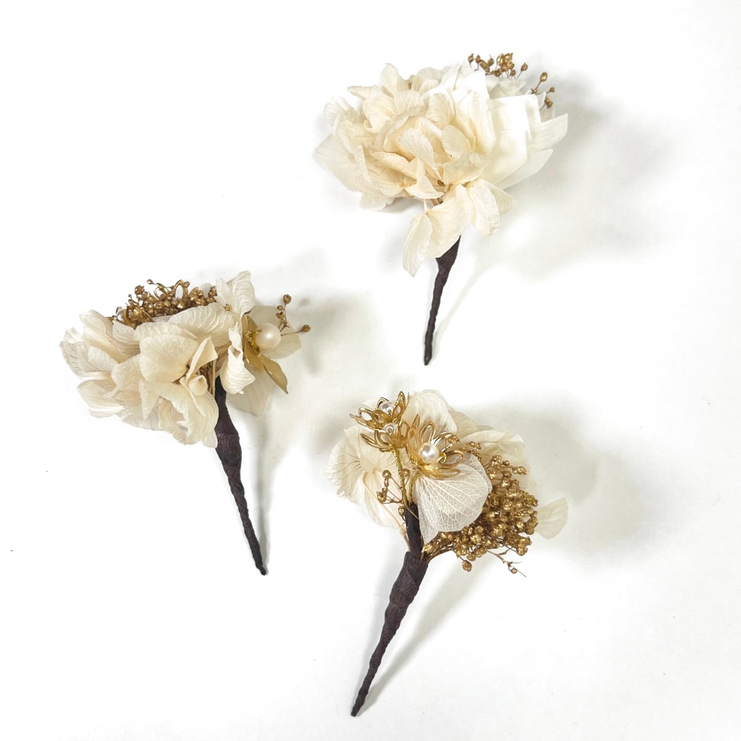 ダリアを除き全てピン仕立てなので、一ヶ所にまとめてボリューム感を出してもいいし、まとめずに全体的に散らしたバランスでつけるのもOK。