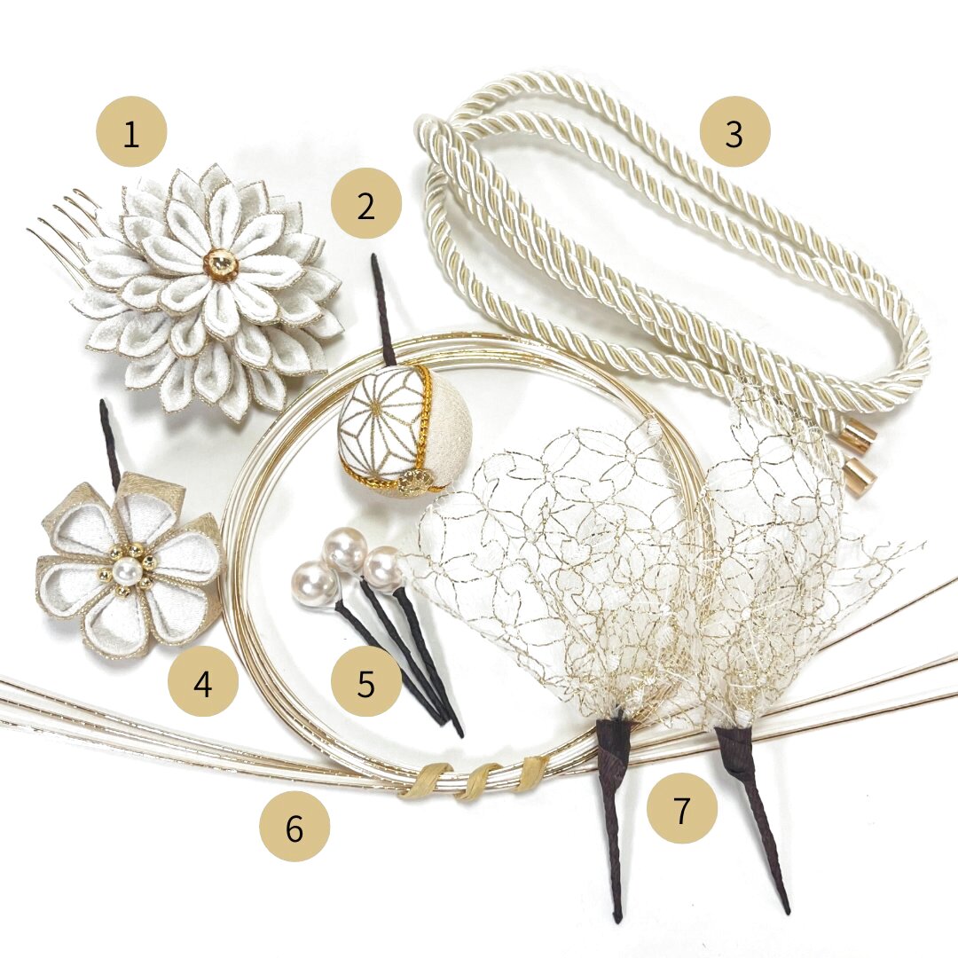 前撮り(後撮り)撮影と式典当日はヘアスタイル・髪飾りをつけるバランスを変えて、違う雰囲気の髪飾りとしてお楽しみいただけます。