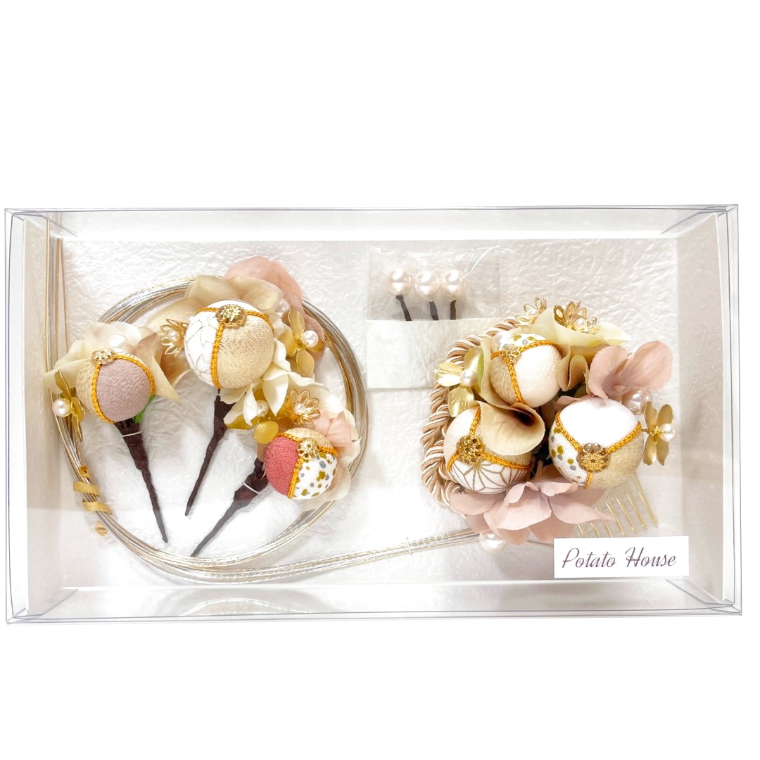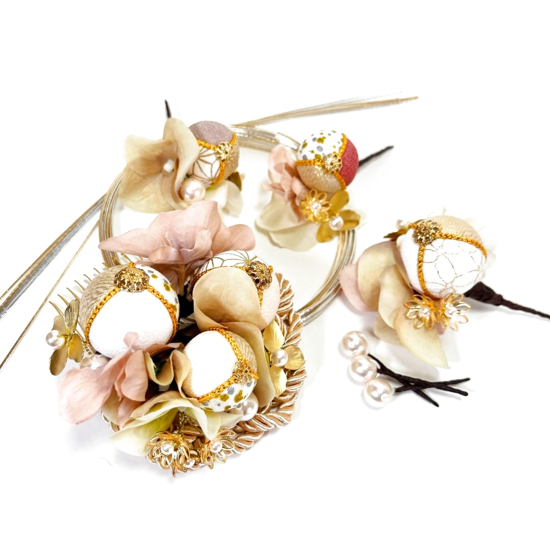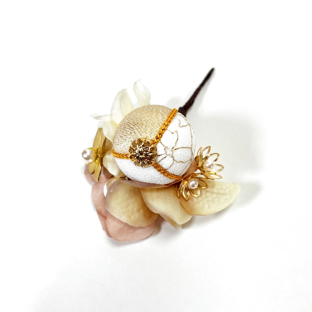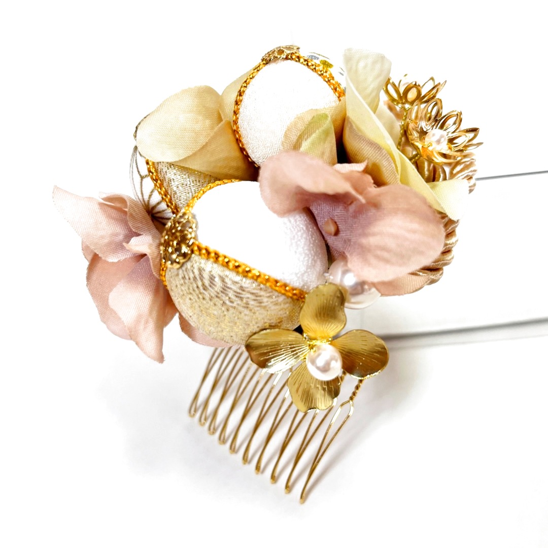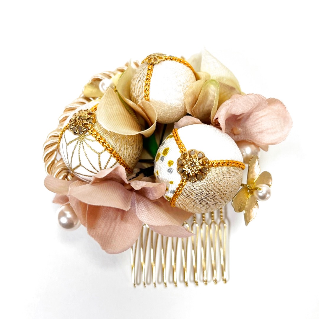 2種類の大きさ、6個の玉飾りを、メタルフラワーやアーティフィシャルフラワーと共にコーム・ピンに仕立てました。