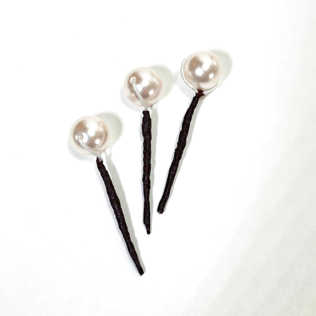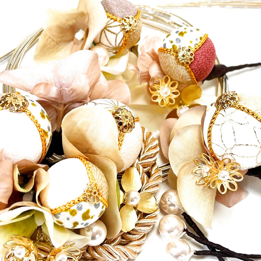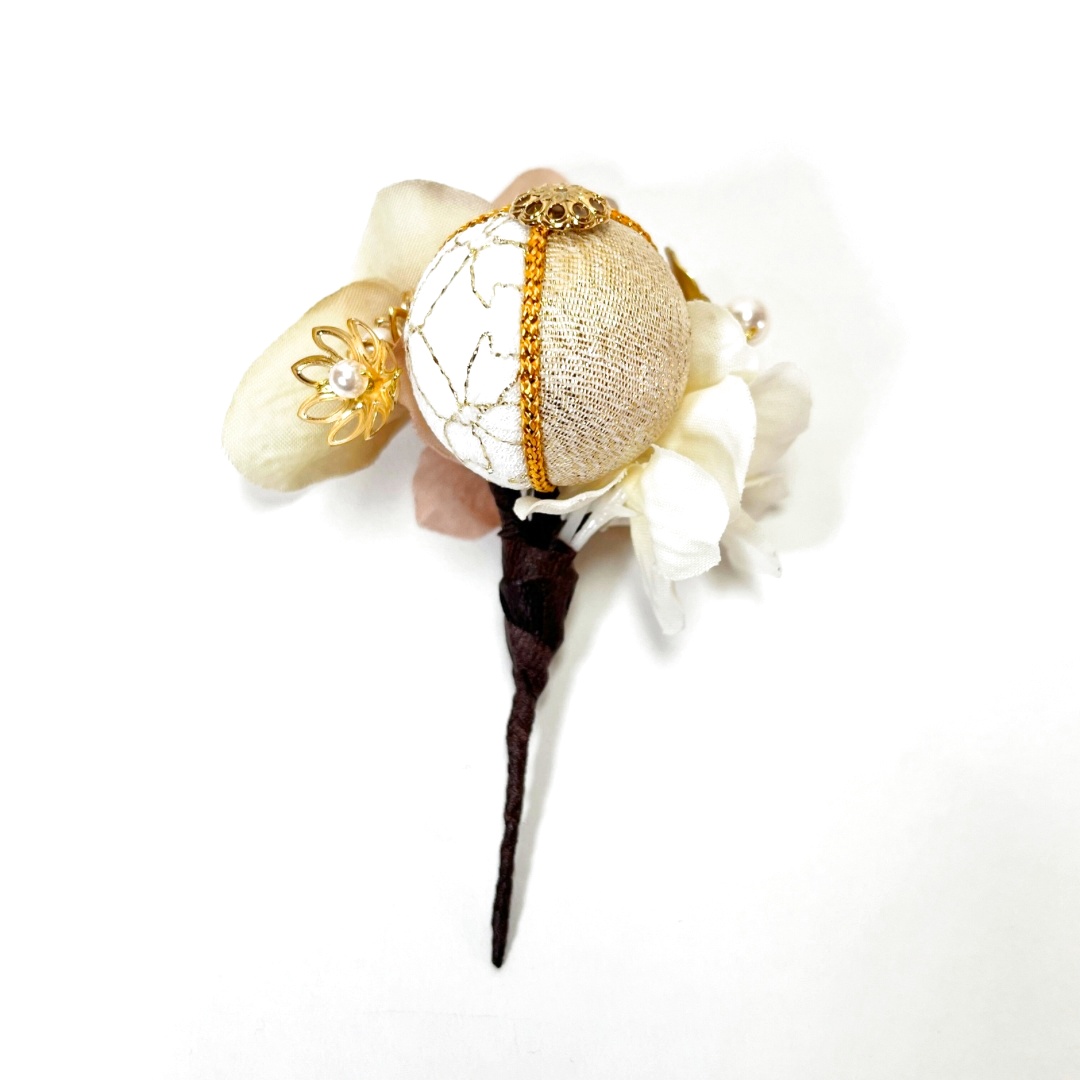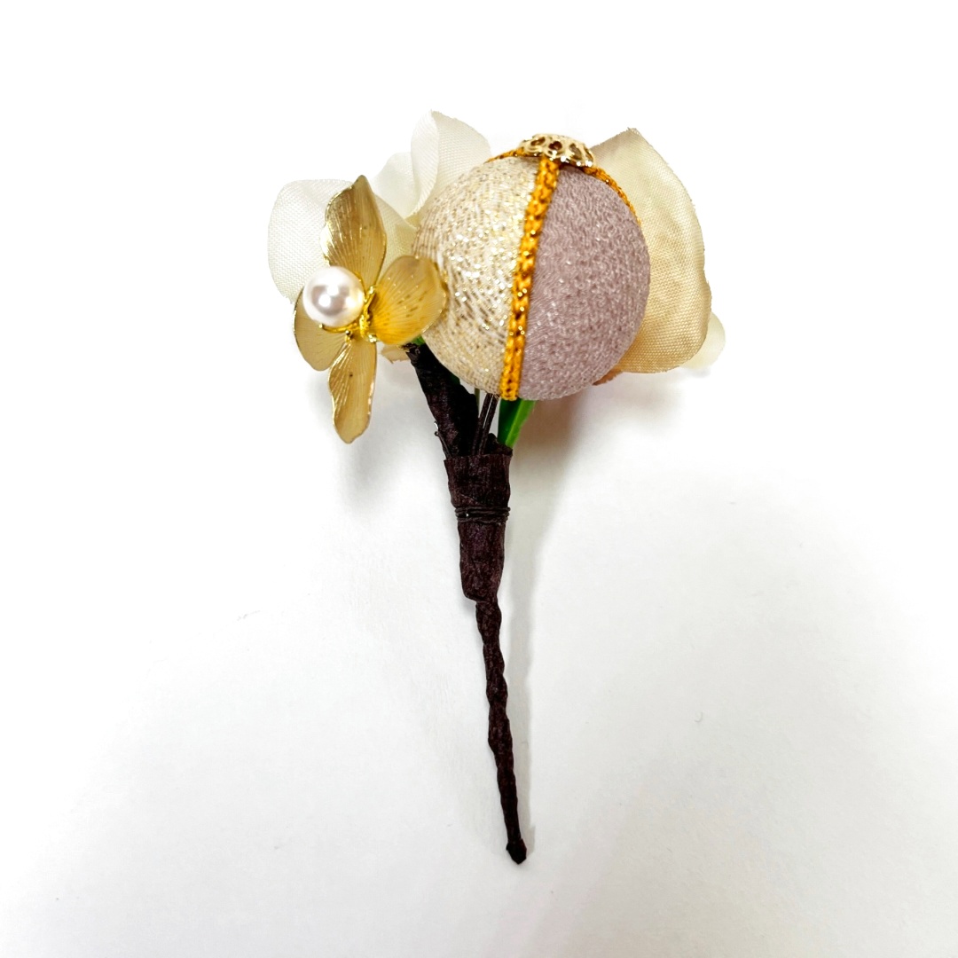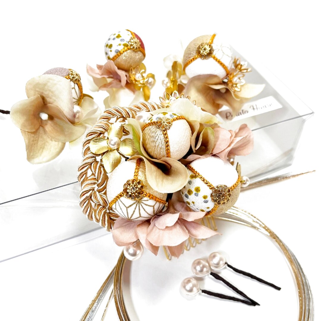 2種類の大きさ、6個の玉飾りを、メタルフラワーやアーティフィシャルフラワーと共にコーム・ピンに仕立てました。