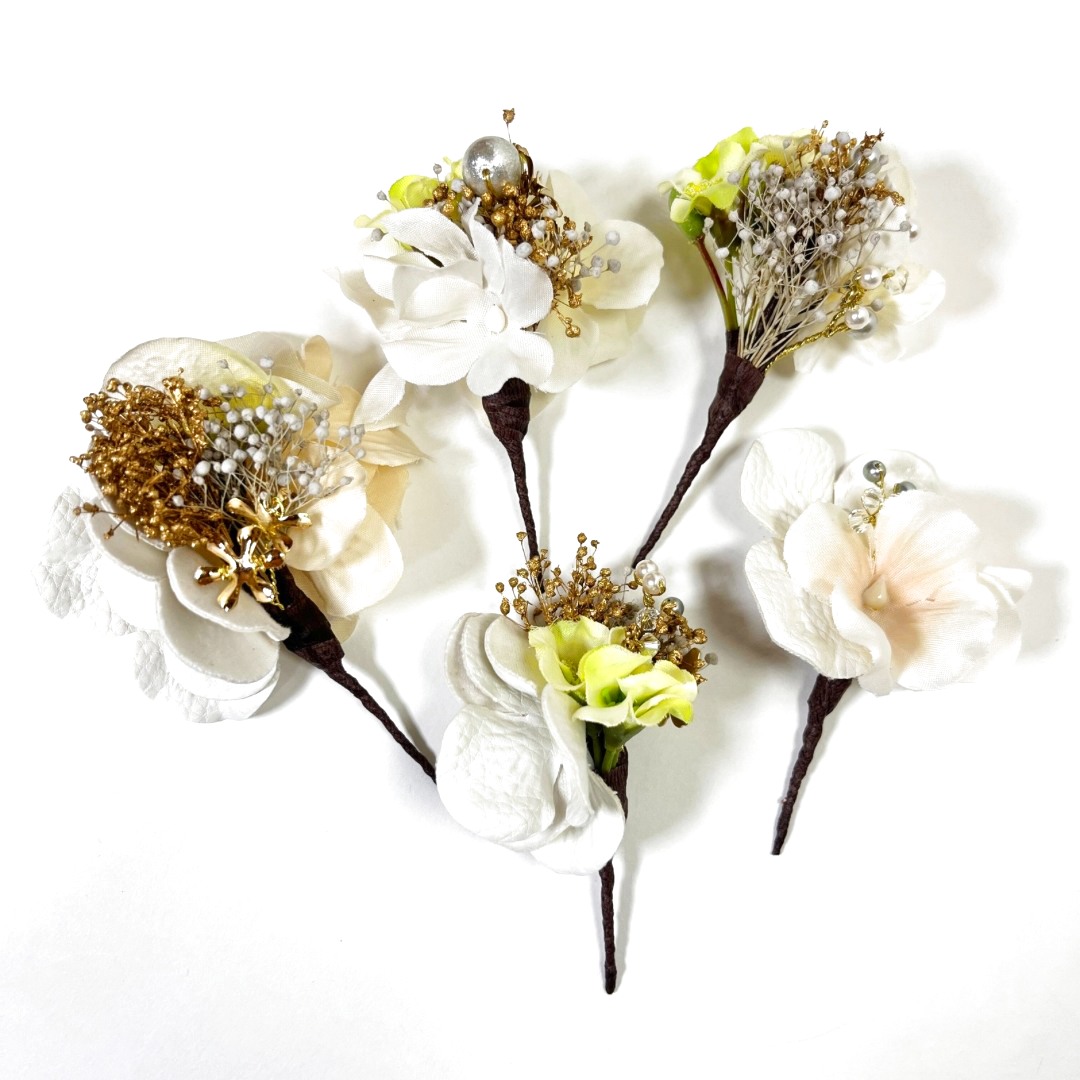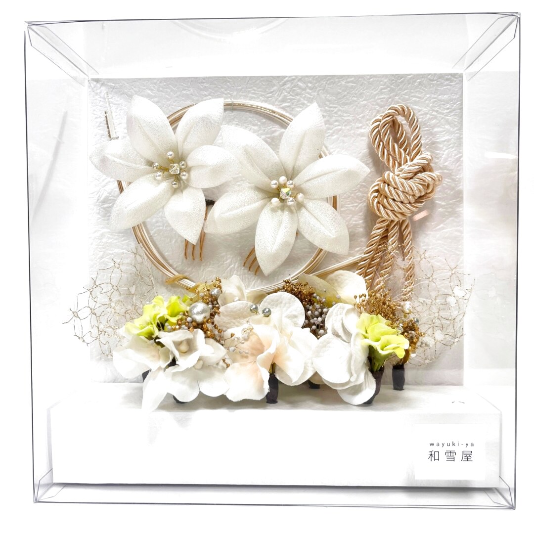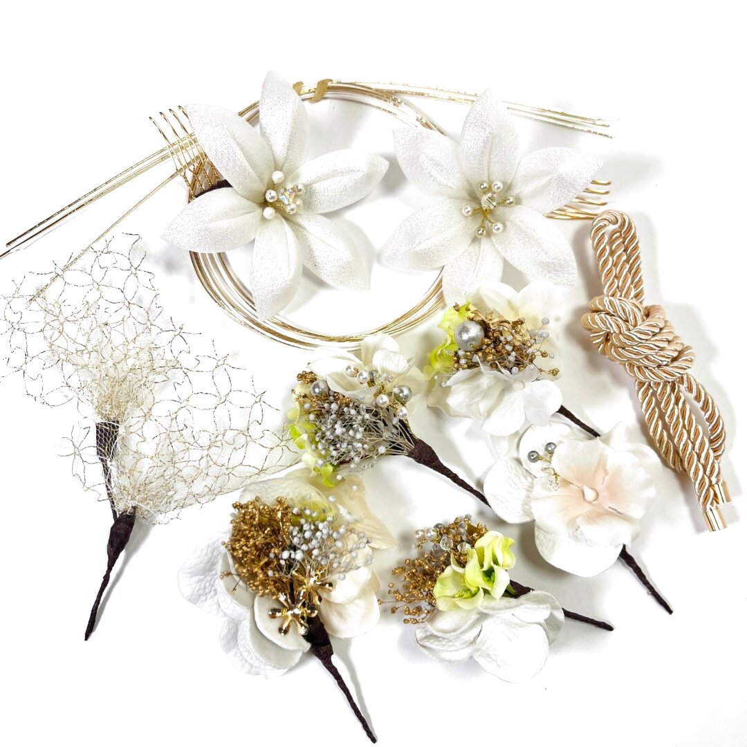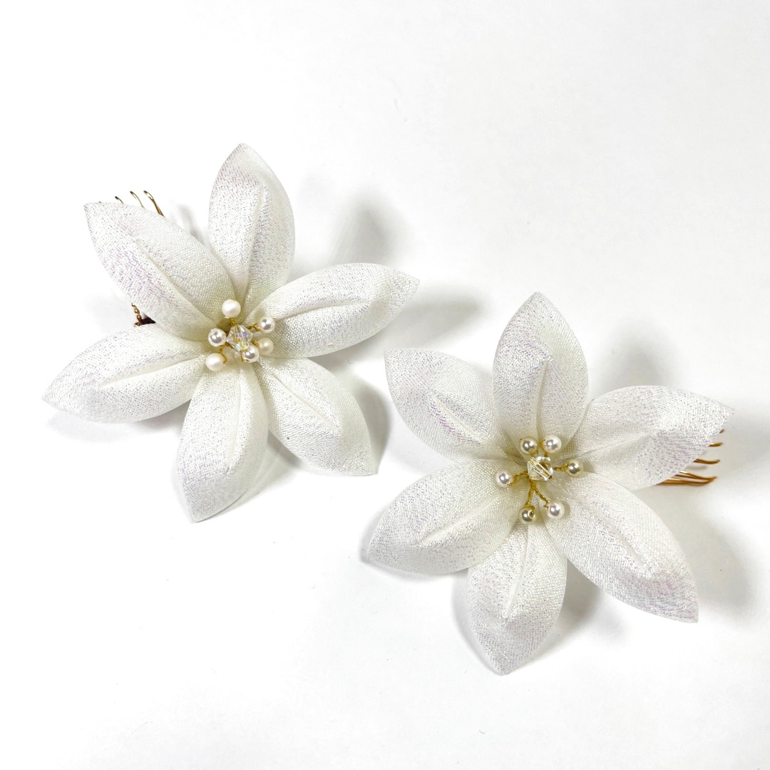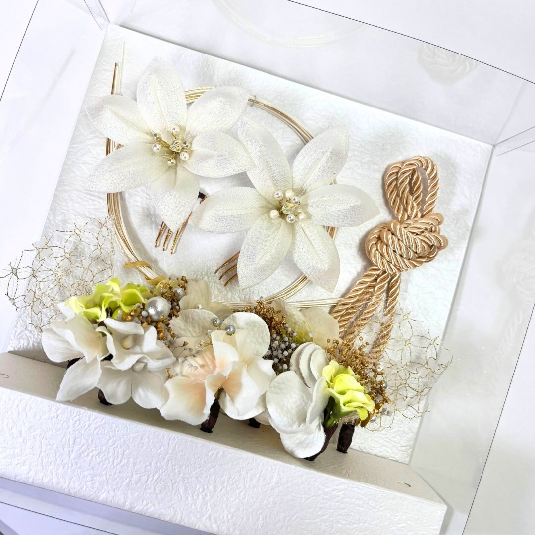 直径9cmの大ぶりな白百合とプリザーブドフラワーを合わせた髪飾りセット。