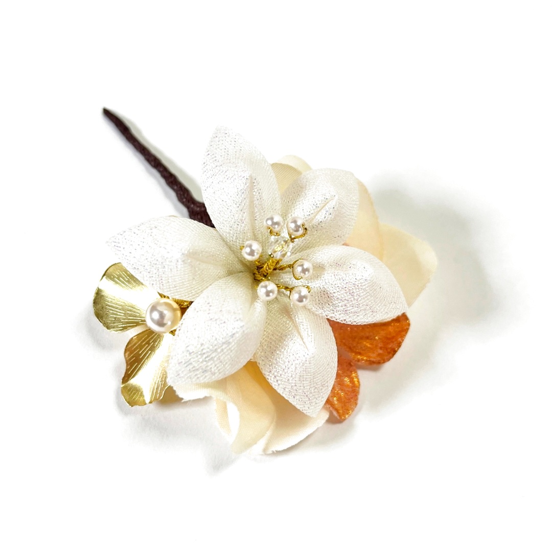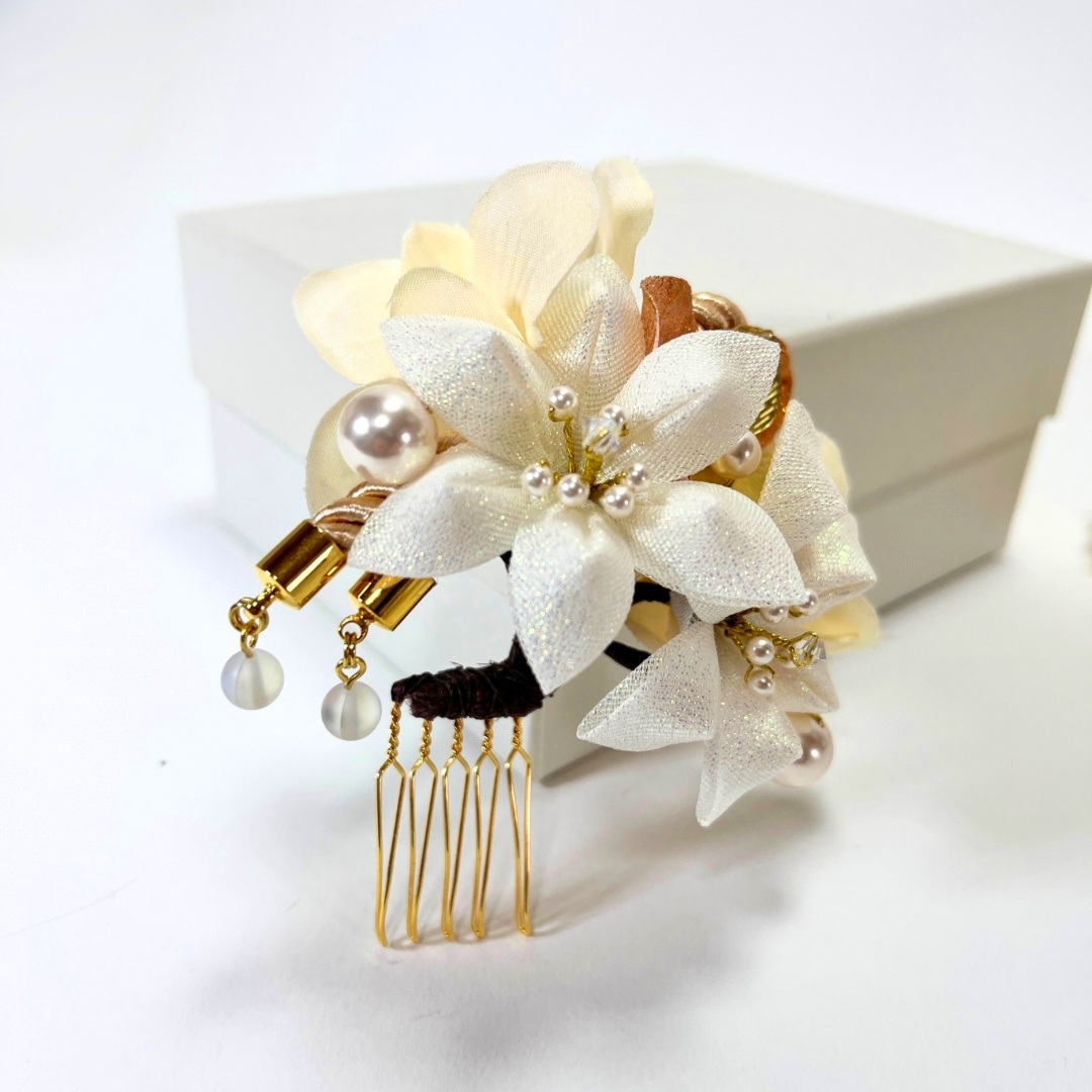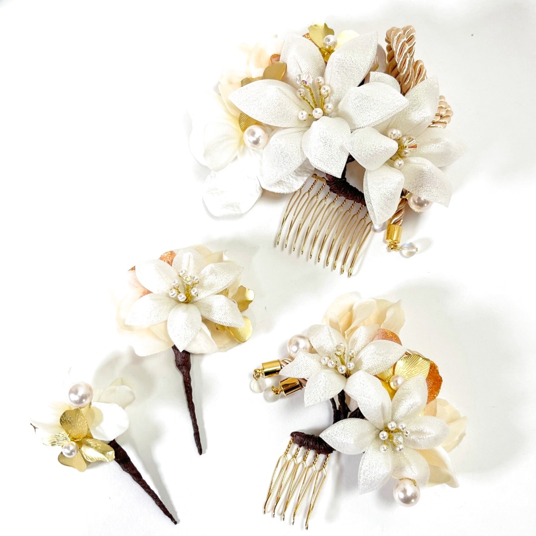 ふっくらと花びらを重ねた、小ぶりな白百合を主役にした髪飾りセットです。