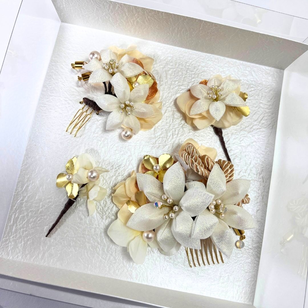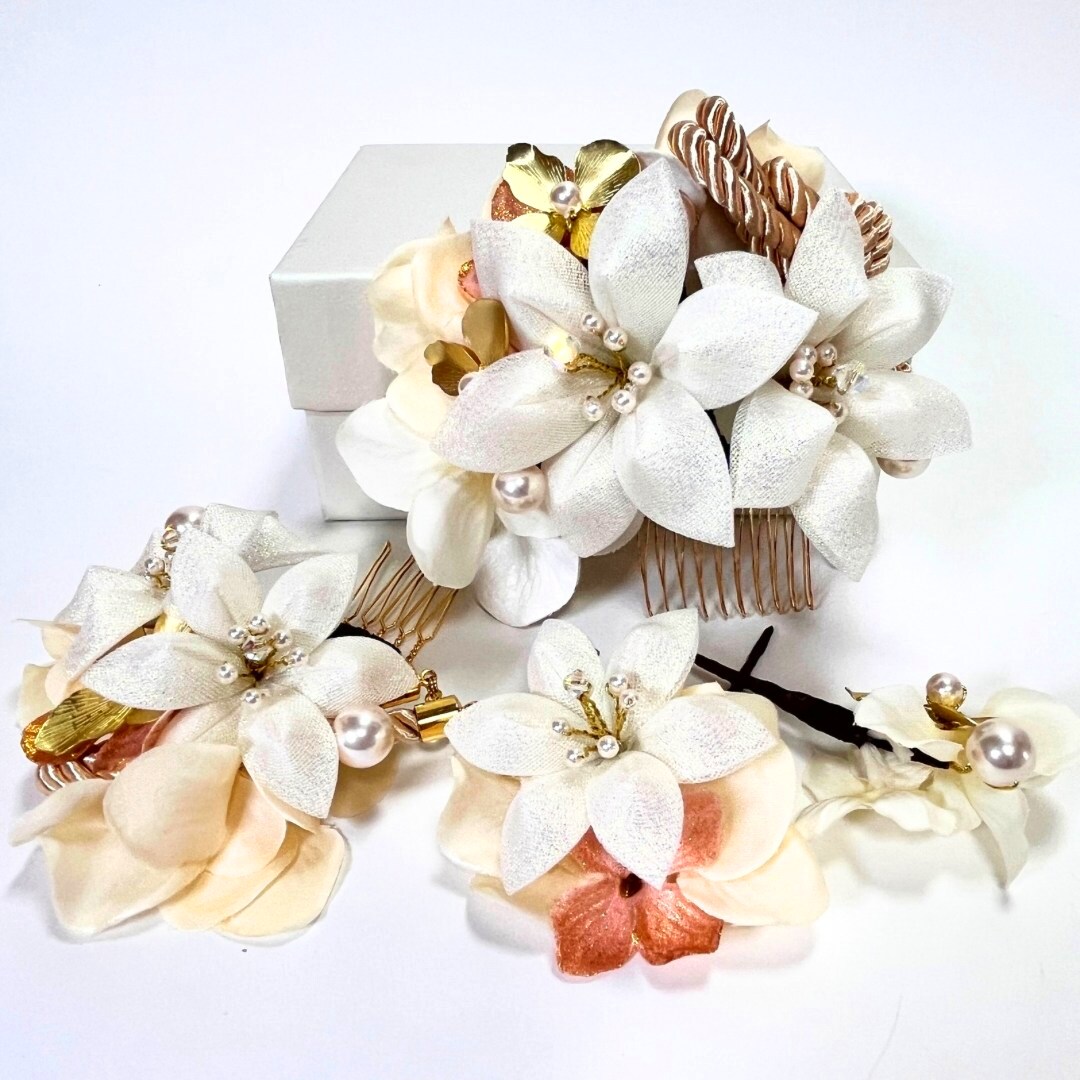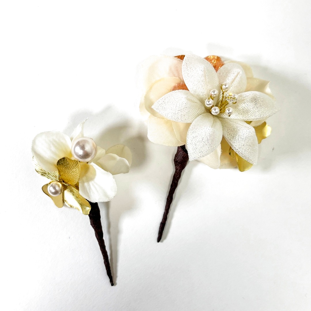 ふっくらと花びらを重ねた、小ぶりな白百合を主役にした髪飾りセットです。