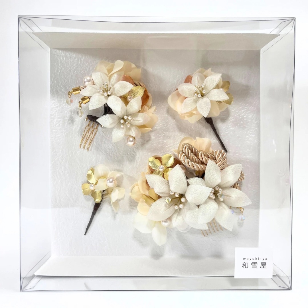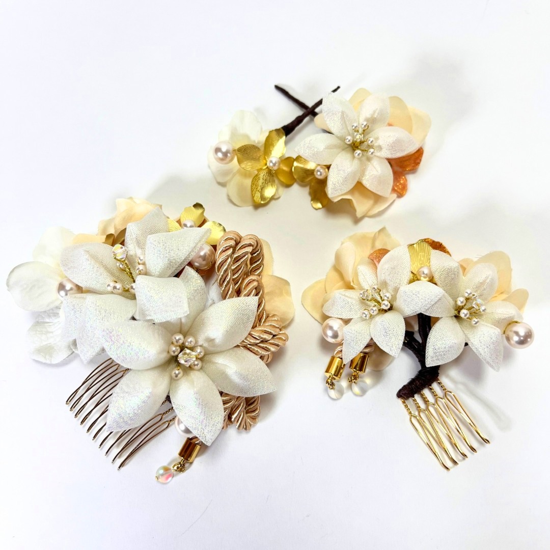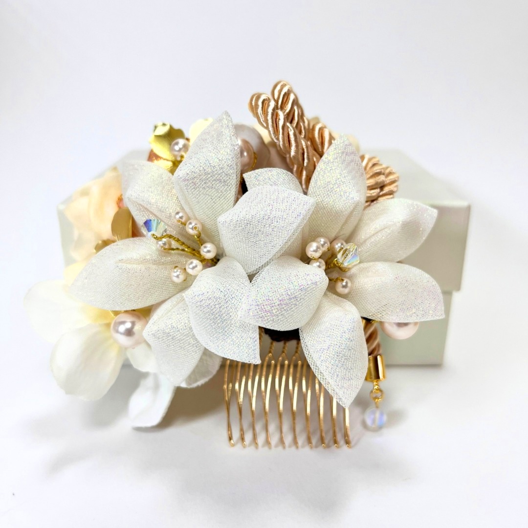 白系の髪飾りは、振袖や袴の色柄を選ばず合わせやすいのが魅力。