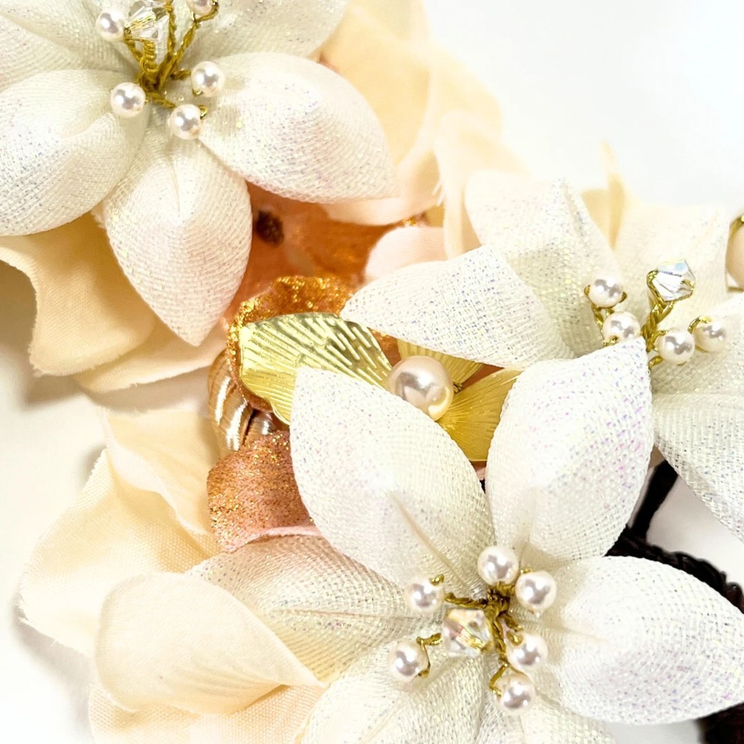 大小さまざまな大きさの樹脂パールをあしらい、可憐さの中に上品な華やぎを添えています。