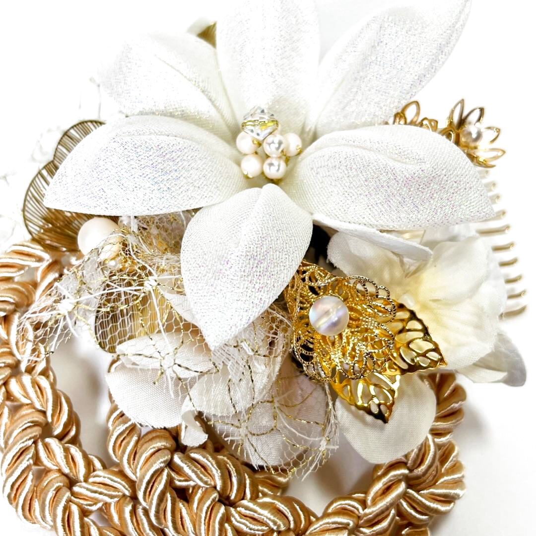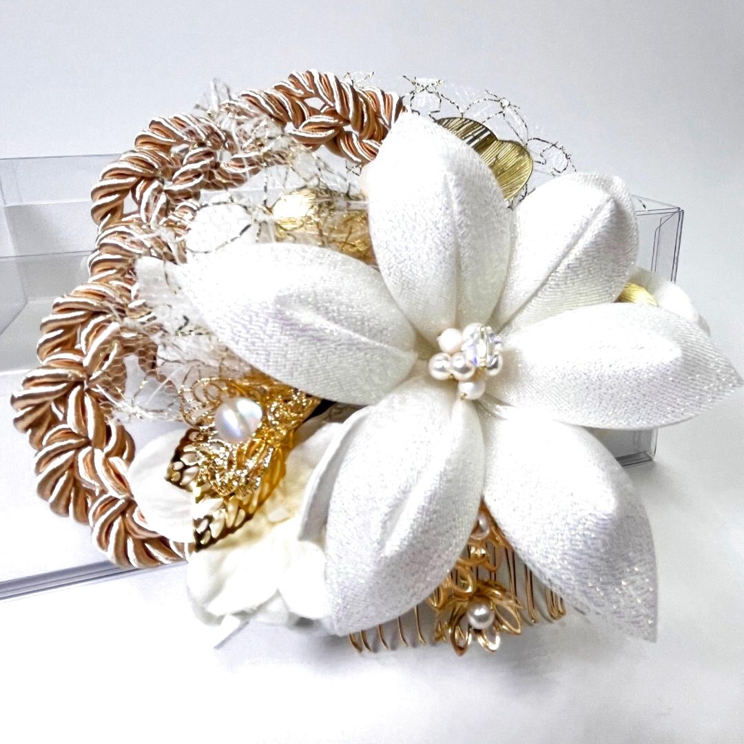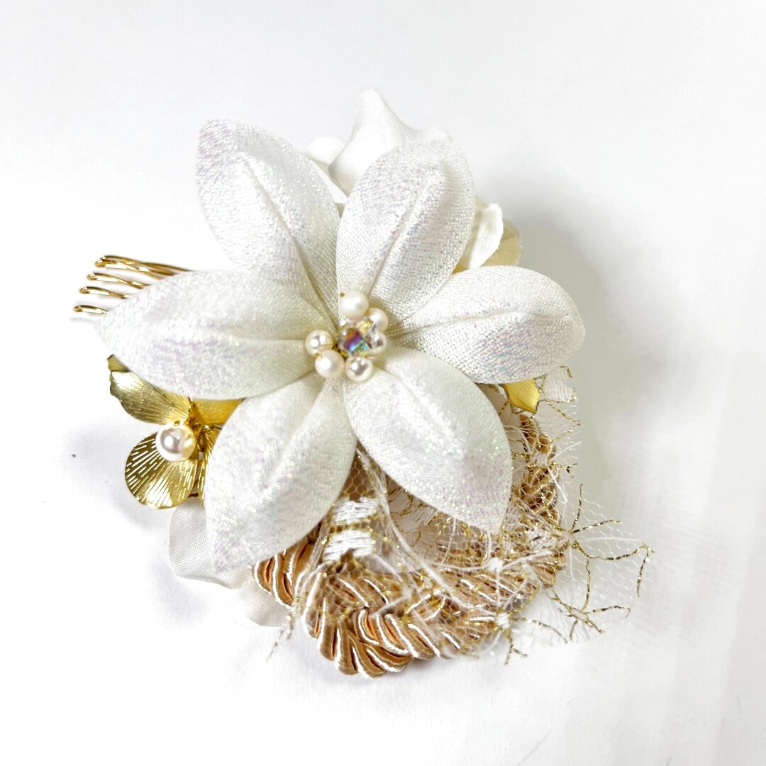白百合以外はゴールドとアイボリーのみで色味を抑え、白が主役の髪飾りに。