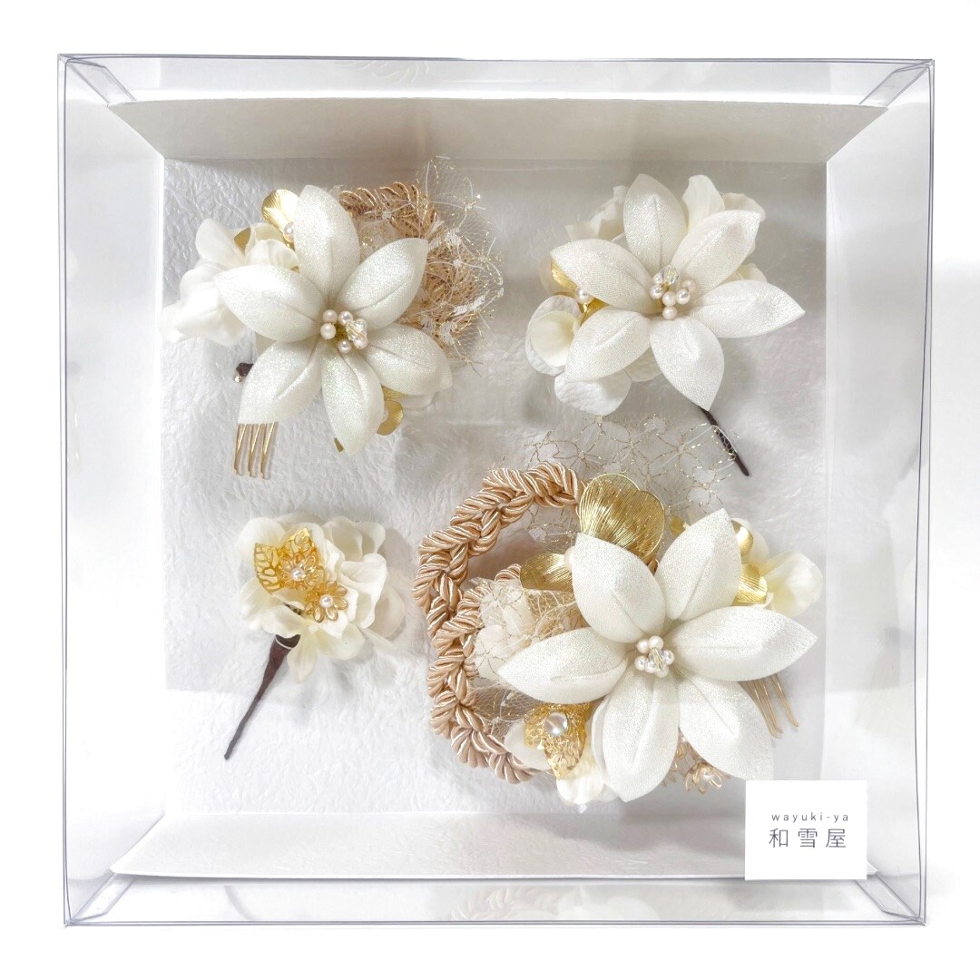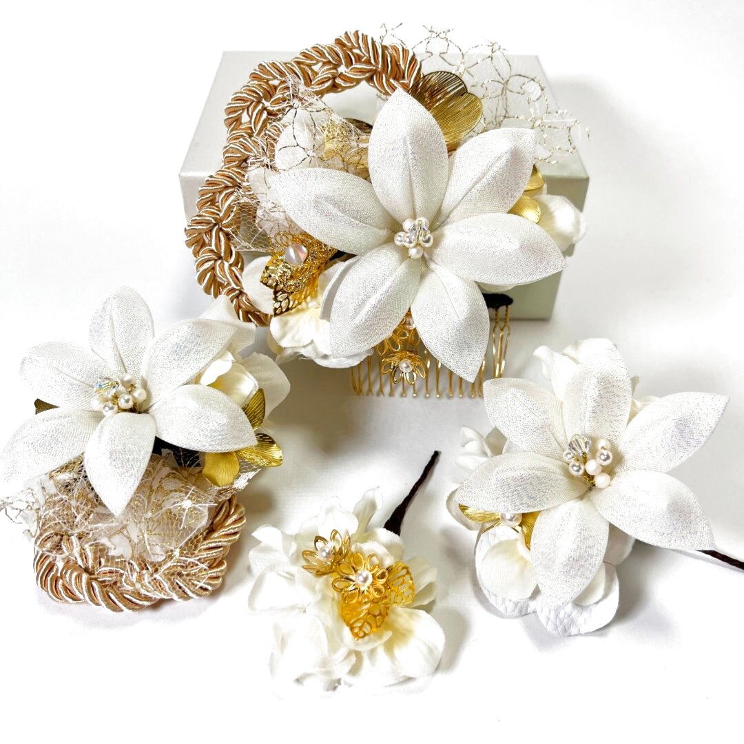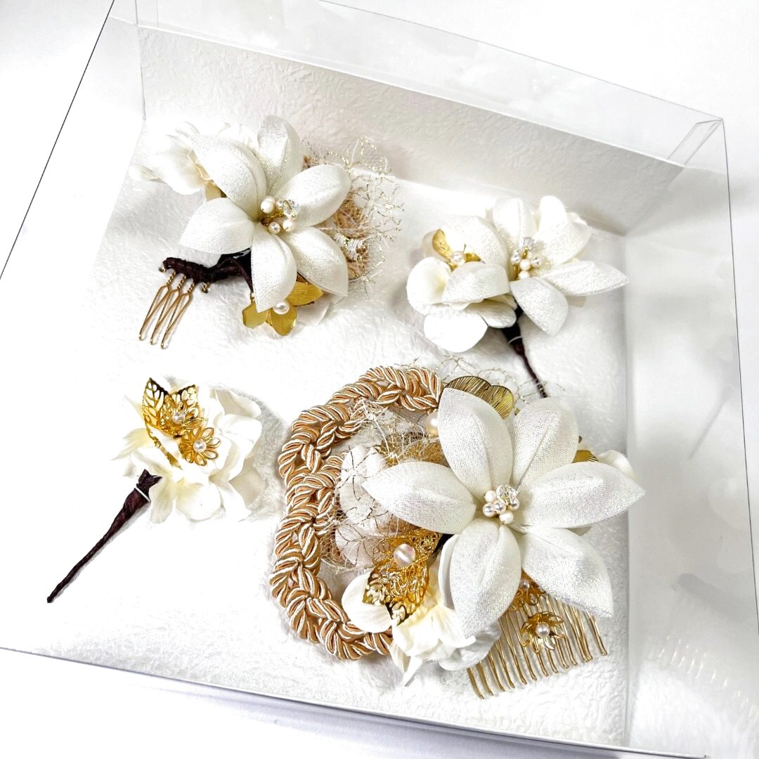 白百合以外はゴールドとアイボリーのみで色味を抑え、白が主役の髪飾りに。